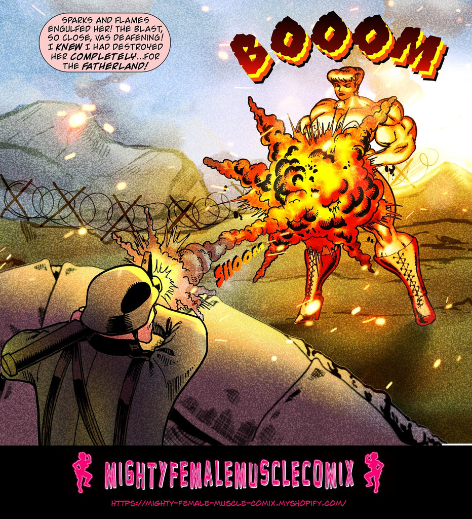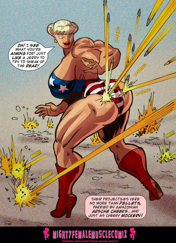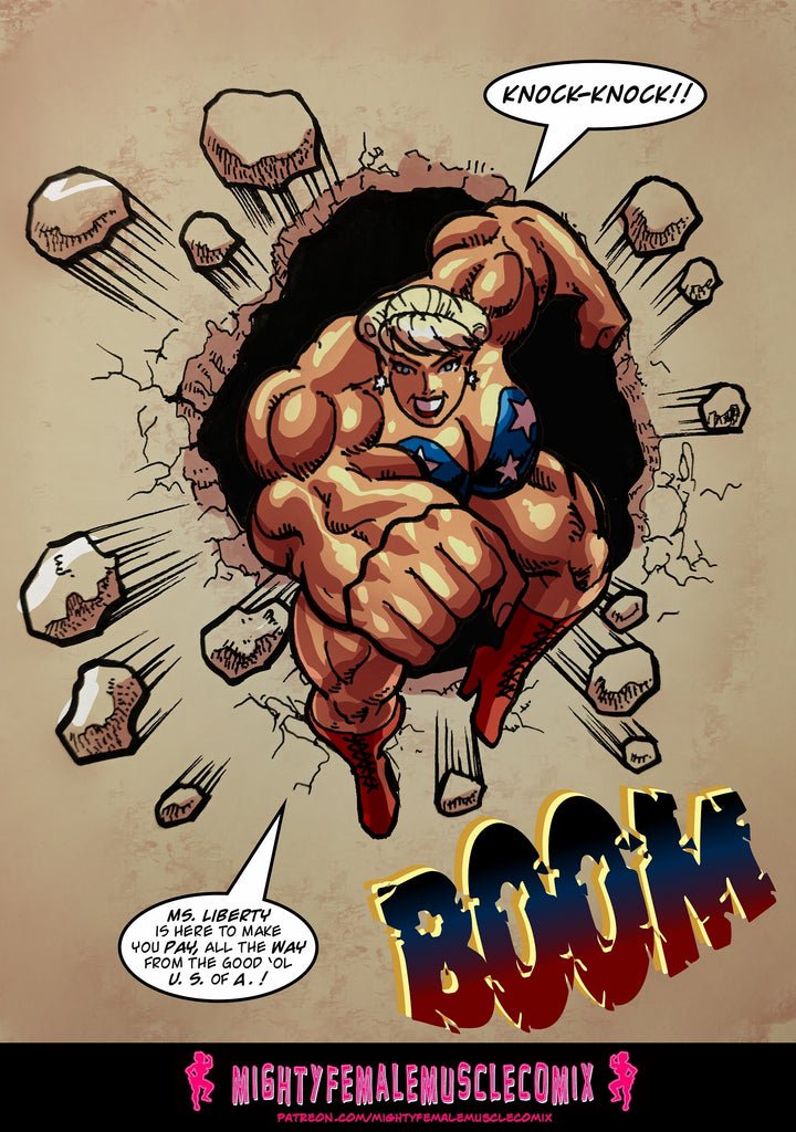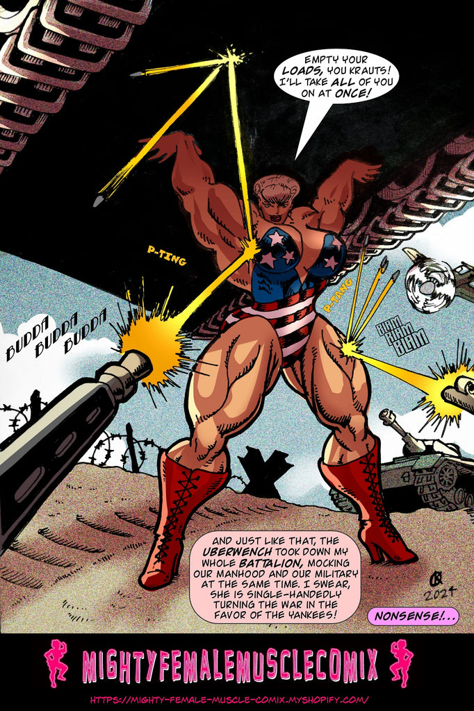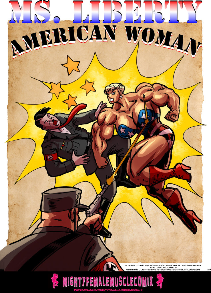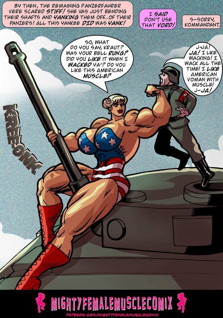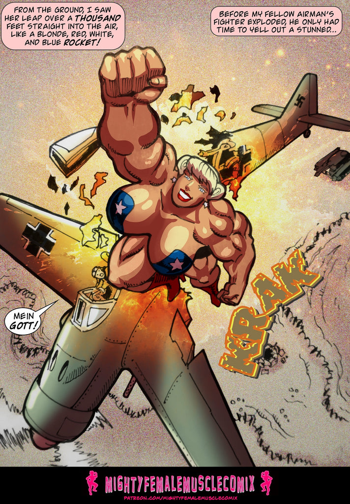 This is a 65 page comic. It was released previously in installments on the Mighty Female Muscle Comix Patreon Page. It's collected for the first time here in a pdf. This comic contains lots and lots of superhero action, as Ms. Liberty bashes and breaks tanks with her bare arms, leaps through the air and crashes through crushes fighter planes, Bullets bounce of her, bombs don't even scratch her, and she tosses aircraft bombs like they were baseballs, and she rips off tank turrets and uses them as baseball bats. This is a really fun comic for people who love superhero action.